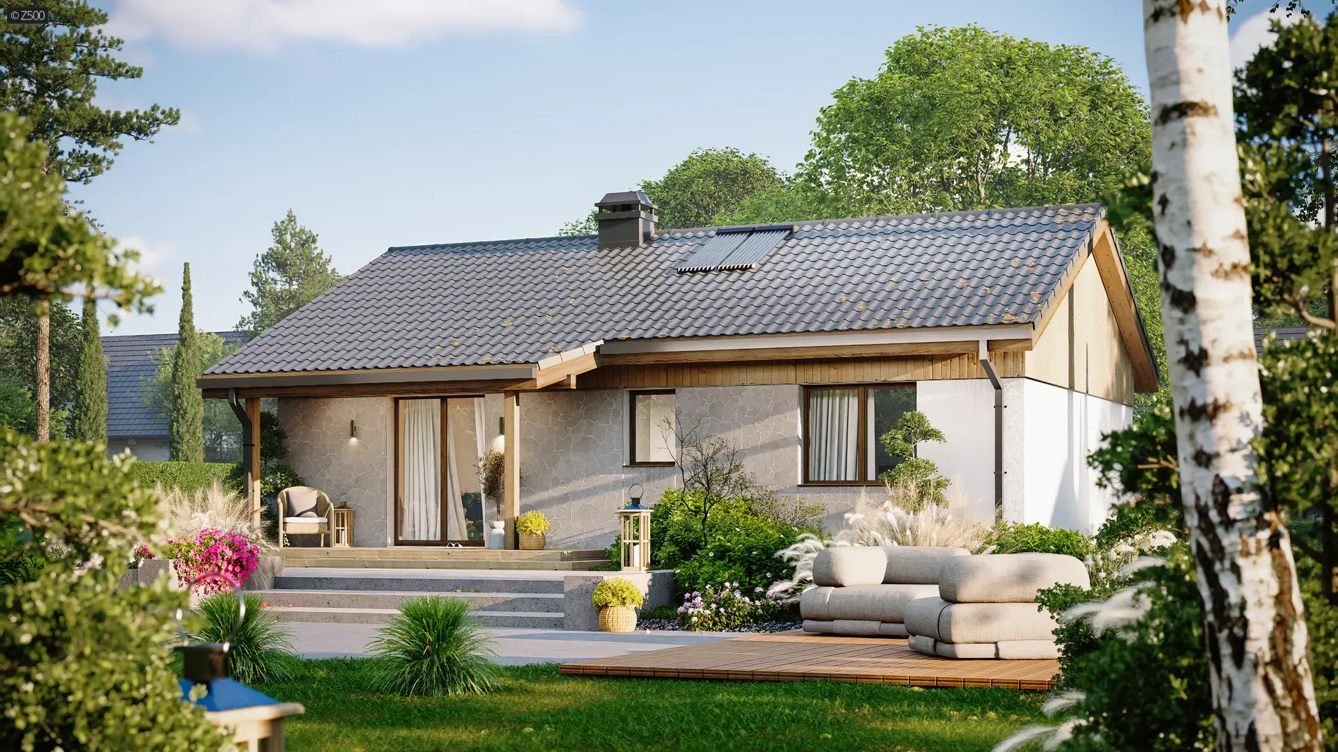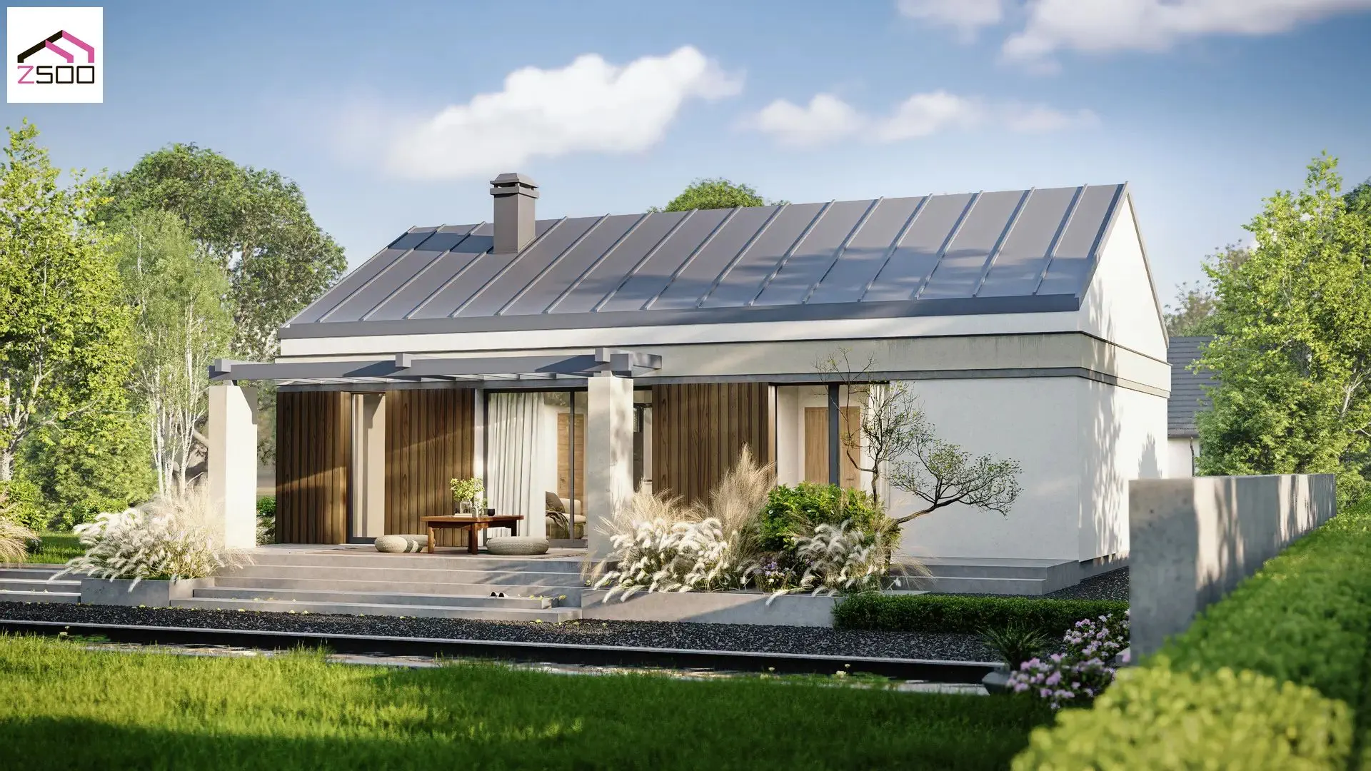 Z50871 m²Проект одноэтажного дома с металлической кровлей и спокойной архитектурой фасада