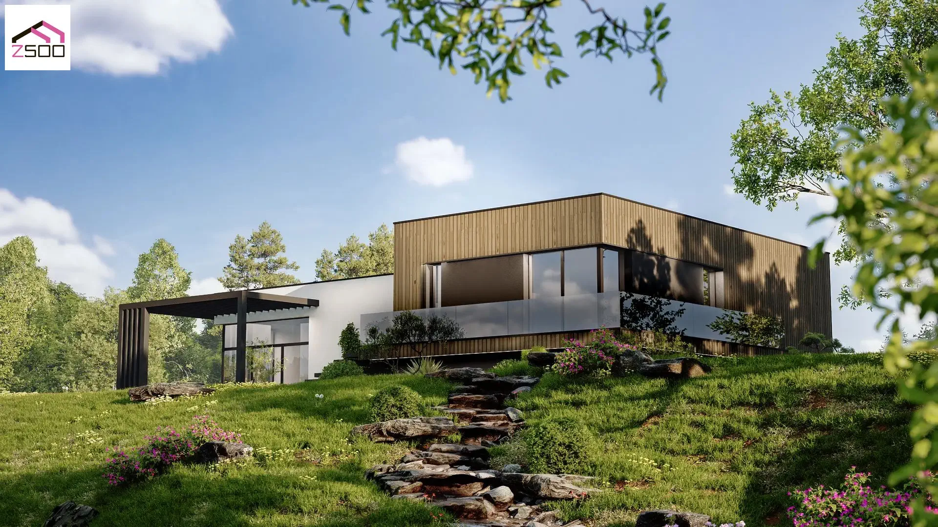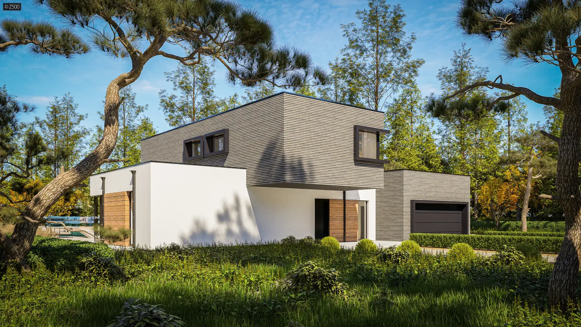 Zx190216 m²Проект современного дома с плоской кровлей и подземным гаражом.